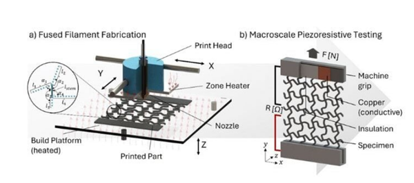本研究建立在該團(tuán)隊(duì)先前使用炭黑增強(qiáng)聚乳酸(PLA)開展的工作之上,他們構(gòu)建了一個(gè)包含56種不同拉脹晶格結(jié)構(gòu)的庫(kù)。在去年發(fā)表的那項(xiàng)早期研究中,該團(tuán)隊(duì)設(shè)計(jì)了能夠顯著拉伸、檢測(cè)微小形變并承受高載荷的晶格結(jié)構(gòu)。與聚醚醚酮(PEEK)結(jié)構(gòu)類似,PLA晶格可以導(dǎo)電,并通過壓阻效應(yīng)的變化對(duì)機(jī)械形變做出響應(yīng)?!盎赑LA的設(shè)計(jì)非常適合臨時(shí)應(yīng)用,例如低載荷生物醫(yī)學(xué)植入物中的智能支架,或嵌入運(yùn)動(dòng)器材中的一次性傳感器,”Kumar先生補(bǔ)充道。另一方面,基于PEEK的材料則為在更嚴(yán)苛的環(huán)境中制造永久性、承重智能組件鋪平了道路。