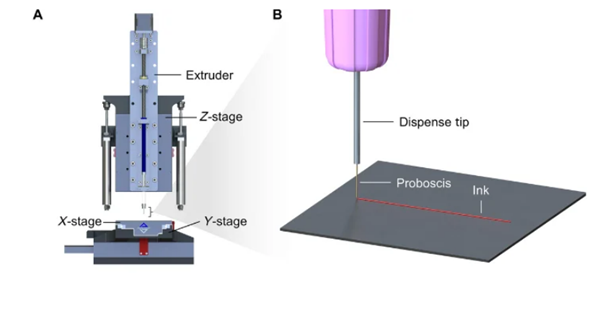 盡管外形纖細(xì),但這種觸須結(jié)構(gòu)堅(jiān)固。測(cè)試表明,它可以承受約60千帕的內(nèi)部壓力,足以讓濃稠的生物墨水穿過(guò)而不破裂。研究人員開(kāi)發(fā)了一種直接寫入裝置,并將觸須連接到標(biāo)準(zhǔn)的30G金屬針頭上,使其能夠連接到注射器擠出機(jī),并在打印平臺(tái)上精確移動(dòng)。